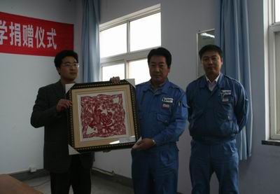 图为:市聋哑学校长王永宾(左一)代表学生向日本胜代集团(中国区)代表谷村先生(中)赠送学生剪纸作品.
