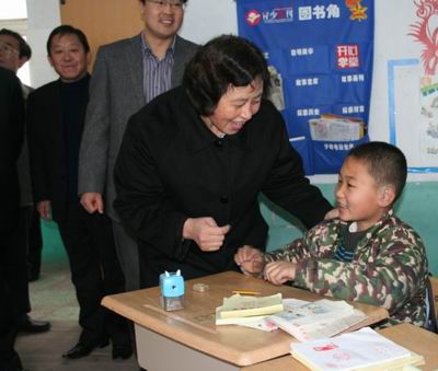 图为:市政协副主席、市慈善总会副会长苑星莲女士看望聋哑学生.