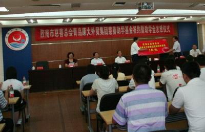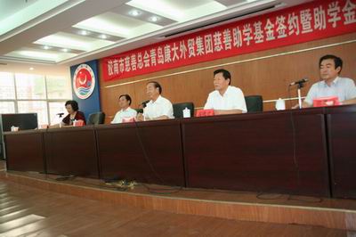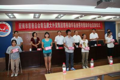 8月26日上午,胶南市慈善总会在市民政局五楼会议室举行青岛康大外贸集团慈善助学基金签约暨助学金发放仪式,并为我市100名贫困家庭的大学生发放了助学金。