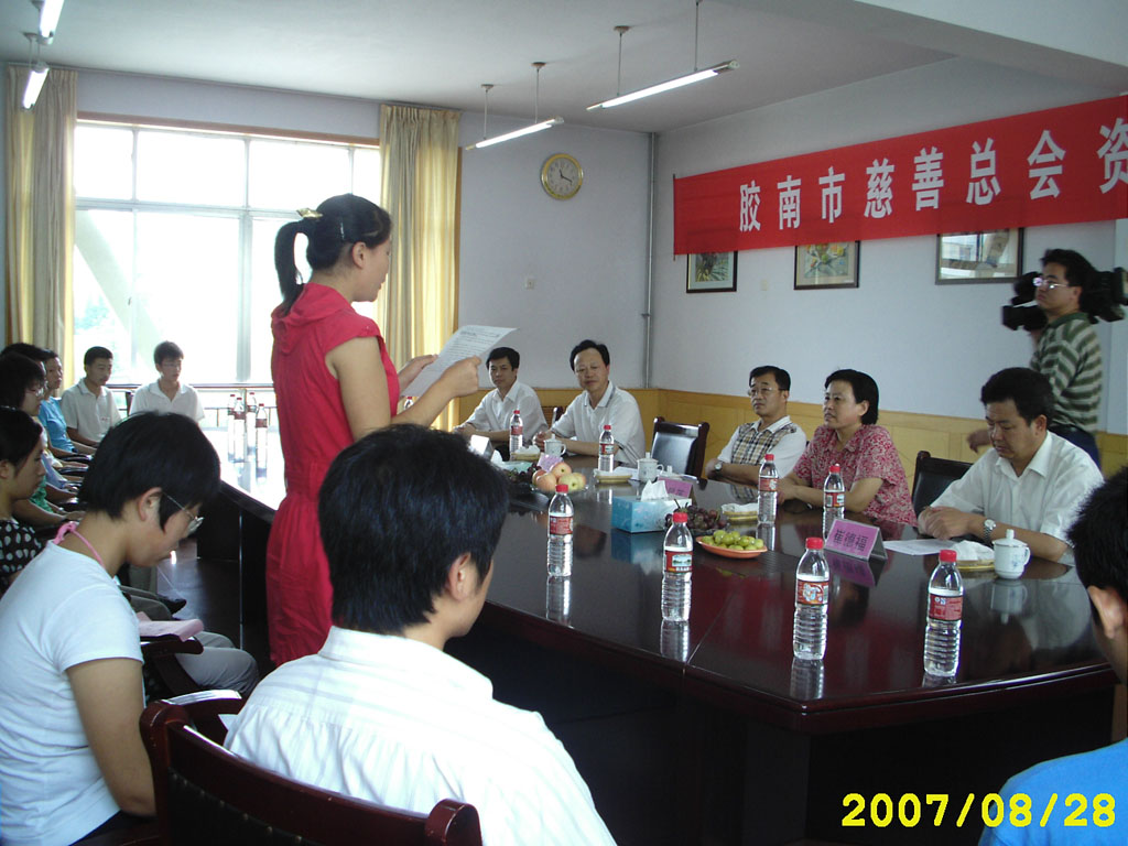 8月28日,胶南市慈善总会分别在该市的第二中学和第五中学召开了2007年度资助大学生座谈会。座谈会上,该市市委常委、副市长、慈善总会副会长杨东亮和市政协副主席、慈善总会副会长苑星莲先后代表慈善总会将装有银行卡的助学金袋分别发放到受助学生手中,这样既保证了资助金的安全,又方便了学生们报到缴费注册。杨东亮和苑星莲在座谈会上都发表了热情洋溢的讲话,他们在讲话中介绍了慈善总会近年来的慈善助学行动为解决贫困大学生入学难题、构建和谐胶南作出的积极贡献;对大学生们提出了殷切希望:希望他们家贫志不贫、奋发图强、认真学习、不断进取、不断提高自身的思想道德素质和科学文化素质,早日成材,回报党和国家的培育之恩和社会的厚爱。